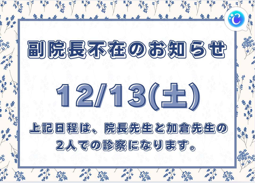 12/13(土)午前中は副院長不在となり、院長先生と現在定期的に来られている加倉先生2人での診察になります。