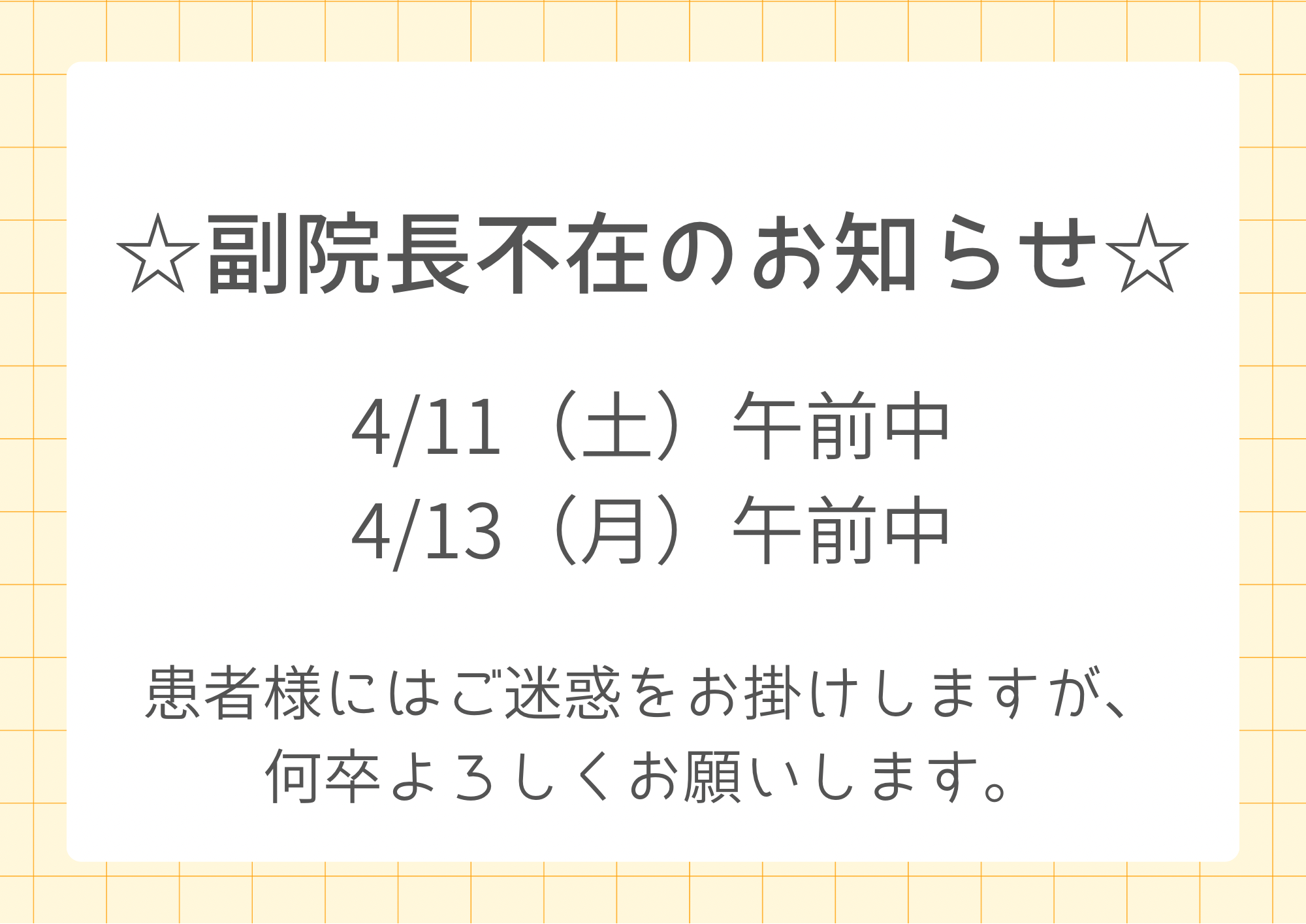 急ではありますが、4/11(土)午前中4/13(月)午前中は副院長不在となります。 4/11は院長と現在定期的に来られている加倉先生2人での診察となり、4/13は院長と室橋先生2人での診察になります。 患者様にはご迷惑をお掛けしますが、何卒よろしくお願いいたします。